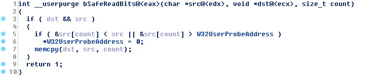 The system call in question is responsible for creating a kernel GDI palette object consisting of N 4-byte color entries, for a user-controlled N. Again, a memory usage optimization is employed by the implementation – if N is less or equal to 256 (1024 bytes in total), these items are read from user-mode to a kernel stack buffer using win32k!bSafeReadBits; otherwise, they are just locked in ring-3 memory by calling win32k!bSecureBits. As you can guess, the memory region with the extra memset applied to it is the local buffer used to temporarily store a list of user-defined RGB colors, and it is later passed to win32k!EngCreatePalette to actually create the palette object. The question is, how do we have the buffer remain uninitialized but still passed for the creation of a non-empty palette? The answer lies in the implementation of the win32k!bSafeReadBits routine:
