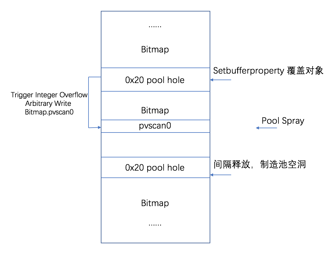 通过这种方法可以制造一个0x20的pool hole,然后可以利用整型溢出覆盖到布局在后面bitmap的pvscan0,从而完成data attack,但是这种情况有问题,一会会提到。