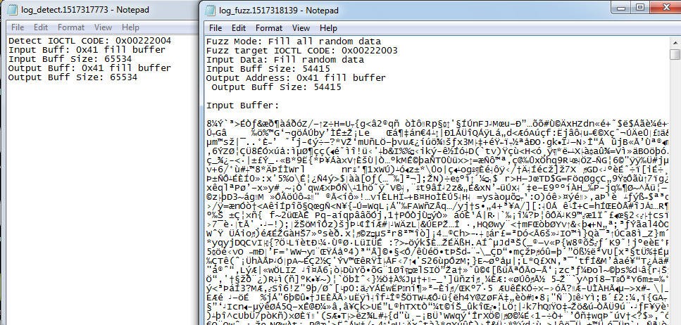 第三个问题,我在探测日志和fuzz日志记录的时候只记录了当前fuzz的内容,也就是当前ioctl code的,当前输入参数的内容,过往的都覆盖掉了,因为我尝试过在文件末尾写入,但是由于FILE_FLAG_NO_BUFFERING,本来写入的内容就比字符串多得多,还有很多for循环,稍微写一会就上G的文件了,除非硬盘够大。这样做就导致了一个问题,比如漏洞是由两个ioctl code产生的(同一个ioctl code两次调用倒不怕,也能fuzz出来,这个我遇到过),比如UAF,double free等等,那么就不利于bsod后的分析,和poc的还原,也能分析出来,但影响速度。