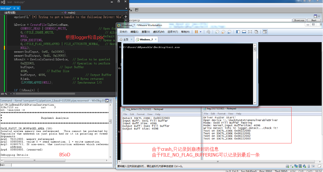 主要问题在于正常的文件写入是会先把写入内容放在一个cache里,写满了再往文件中写,这个主要好像是跟扇区对齐相关,但我们fuzz的时候会产生bsod,整个操作系统都会挂起进入异常处理,这时候缓存内容还没写到文件里,我们就记录不到发生bsod时的漏洞情况。